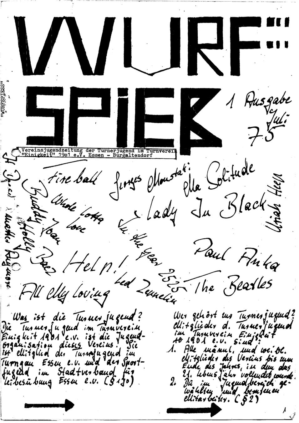 Die Gründungsredaktion, bestehend aus Martin Grimberg, Vilma Plum, Richard Busse und Peter Mölleney, publizierte 1975 die erste Ausgabe des "Wurfspieß", zunächst als Vereinsjugendzeitschrift. Irgendwann wurde der "Wurfspieß" zu einer Informationszeitschrift für den gesamten Verein ausgebaut.