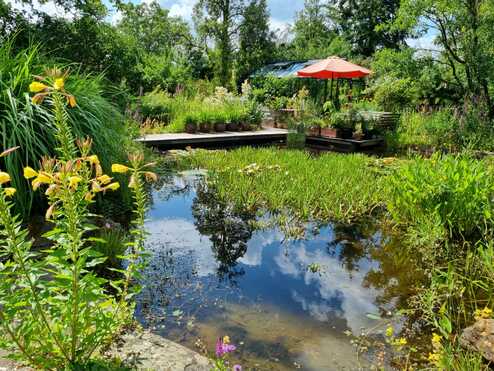 Auch hinter dem Haus befinden sich wieder blühende Staudenbeete. Aber der eigentliche Blickfang ist ein ansehnlicher Teich. Diesen überschreitet man über eine Holzterrasse, die sich über den Teich erstreckt und ein lauschiges Plätzchen zum Verweilen bietet mit Blick auf Seerosen und eine sehr schöne Uferbepflanzung .