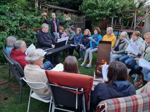 Als unser Chorleiter Stefan sich nach dem Motto „Es tönen die Lieder“ ans E-Piano setzte und der Chor sowohl Volkslieder als auch Popsongs - und das sogar im Kanon - sang, kam Lagerfeuer-Stimmung auf es wurde richtig gemütlich. So sangen wir, bis in der Dunkelheit die Texte und Noten nicht mehr erkannt werden konnten.