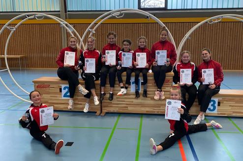 Für die Jüngeren war es der erste Rhönradwettkampf. Die Turnerinnen starteten in der sogenannten Anfängerklasse, bei der keine speziellen Anforderungen an den Küraufbau gestellt werden. In der Altersklasse 7-10 Jahre landeten Marie und Merle punktgleich auf dem zweiten Platz. Ein toller Erfolg für ihren ersten Wettkampf! Lia musste sich leider mit dem undankbaren vierten. Platz zufriedengeben.