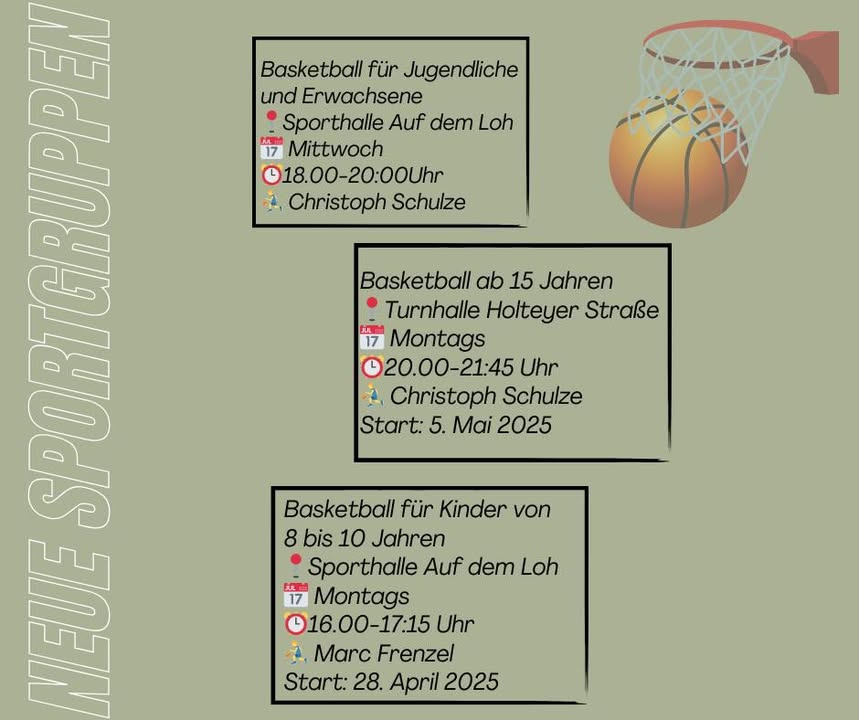 Im Mai 2025 ist eine weitere Basketball-Gruppe entstanden: Basketball für junge Begeisterte ab 16 Jahren, sowohl Anfänger:innen als auch Fortgeschrittene. ️