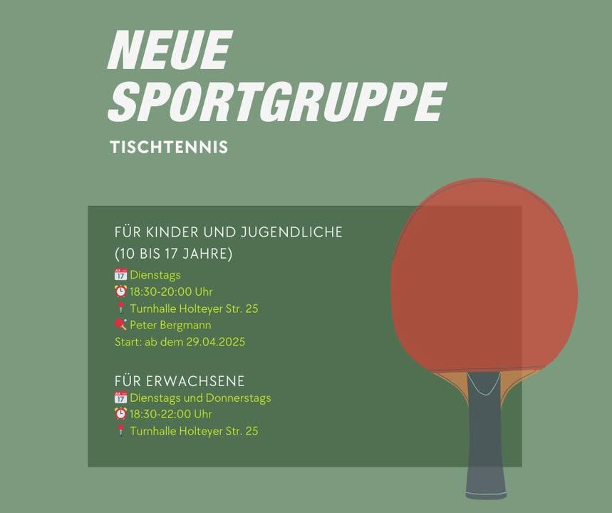 Ab dem 29.04.2025 startet eine neue Tischtennis-Gruppe. Egal, ob man zu zweit im Einzel oder zu viert im Doppel spielt, Tischtennis macht ungemein viel Spaß. In dieser Gruppe können Kinder und Jugendliche zusammen spielen.