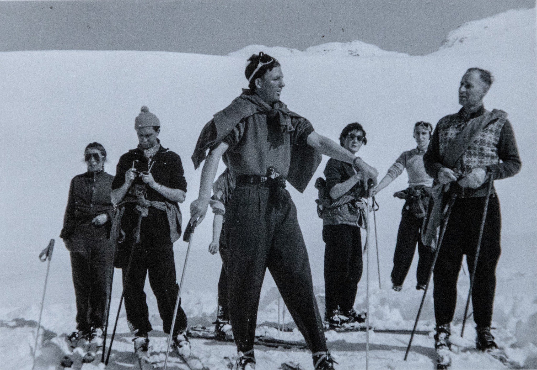 TVE-Mitglieder beim gemeinsamen Skifahren in der Nähe der Schaubachhütte in Südtirol, 1960.