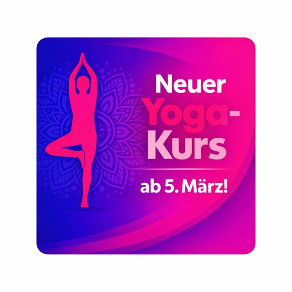 Wir freuen uns, dass wir Euch wieder einen Yoga-Kurs für Anfänger anbieten können. Unter der neuen Leitung von Hannah Körber könnt ihr Euch ab dem 25. März mittwochs von 17.30 bis 19.00 Uhr auf Euren Yoga-Weg machen. Meldet Euch über unsere Homepage oder im AKTIV PUNKT Büro an!