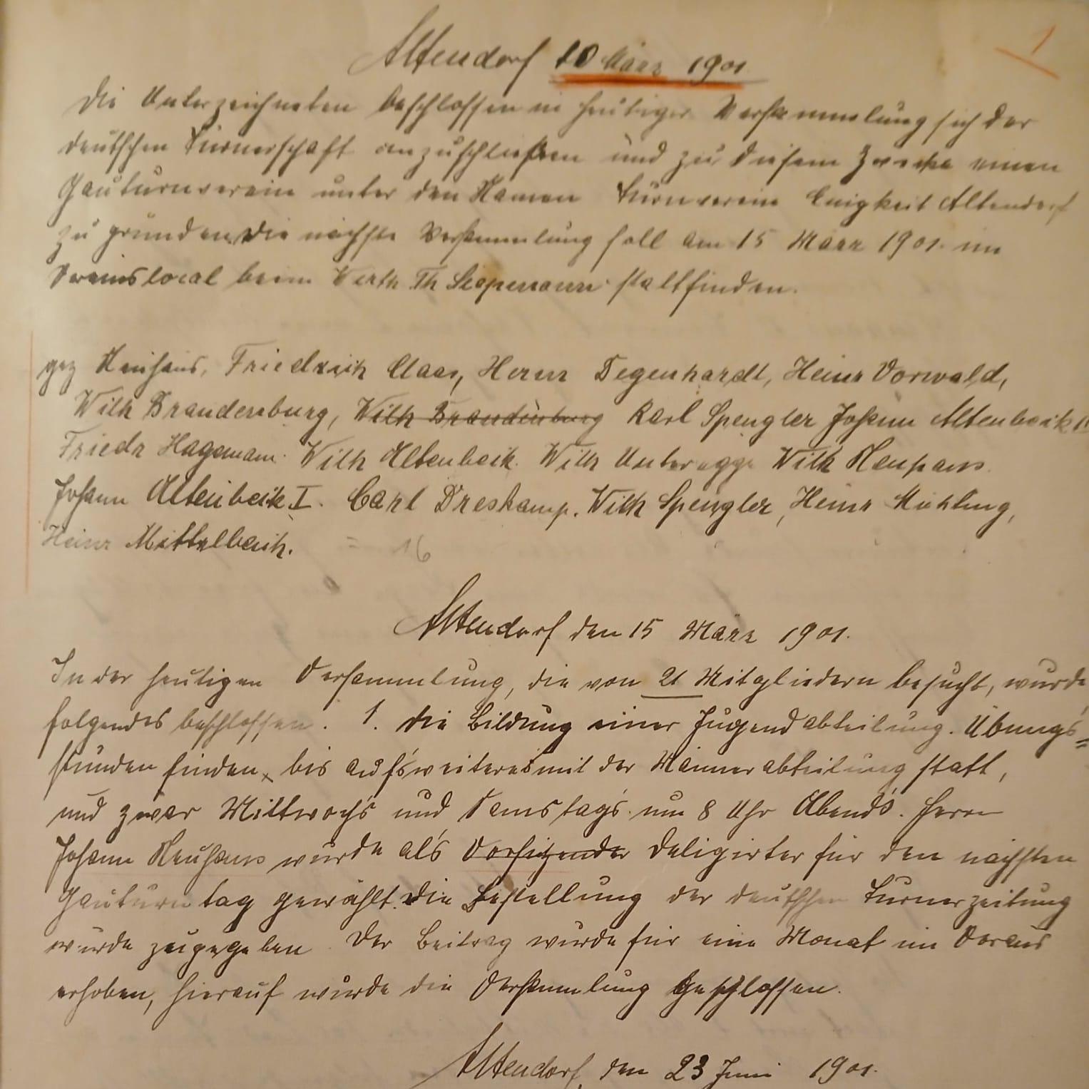 Heute vor 125 Jahren beschlossen 16 Männer in Altendorf einen Sportverein namens Turnverein Einigkeit Altendorf zu gründen - unseren TVE! Das Foto zeigt den entsprechenden Eintrag in die Protokollsammlung. Die Satzung betitelte man als "Grundgesetz des Turnvereins Einigkeit zu Altendorf". Darin ist beschrieben: Die "Gesellschaft hat den Zweck, Gelegenheit und Anleitung zu geregelten Turnübungen zu geben als eines Mittels zur körperlichen und sittlichen Kräftigung[...]". Mitglied konnte werden, wer das "17. Lebensjahr vollendet hat und unbescholten ist." Ab 12 Jahren konnte man als "Zögling" in den Verein aufgenommen werden. Schön, dass wir heute beim Eltern-Kind-Turnen auch den Kleinsten schon Vereinssport ermöglichen!