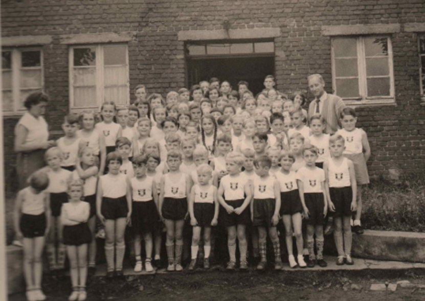 Kinder beim Vereinswettkampf um 1956. Die schwarzen Embleme wurden zuhause auf weiße (Unter-)Hemdchen aufgenäht - fertig war die Vereinsbekleidung.