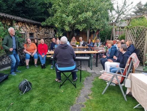 Natürlich ging es nicht nur um das Singen, sondern auch um das gemütliche Zusammensitzen bei leckerem Essen. Dazu durfte das reichhaltige tonARTisten-Buffet nicht fehlen, dazu Würstchen vom Grill. Nachdem alle gut gesättigt waren, holte Stefan sein Keyboard aus dem Auto und nicht nur wir, sondern auch die Nachbarschaft, erfreute sich an unserem Gesang mit spontaner Liedauswahl. Zumindest erhielten Sabine und Heinz eine sehr positive Rückmeldung in dieser Hinsicht.