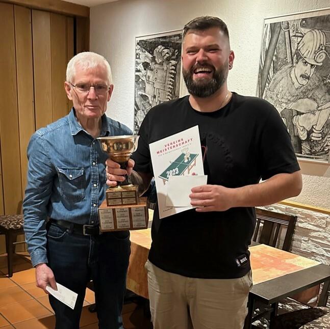 Im Rahmen der gut besuchten Vereinsfeier wurden die Sieger der Vereinsmeisterschaften 2023 geehrt. Den Pokal des Vereinsmeisters hatte sich Jan-Oliver Claßen (im Bild r.) vor Marvin Reimann und dem Vorjahressieger Torben Wagenhals erkämpft. Im Doppel siegten Jan-Oliver Claßen / Marvin Reimann vor Torben Wagenhals / Karsten Linnemann und Lucas Steffen / Nils Weimann.